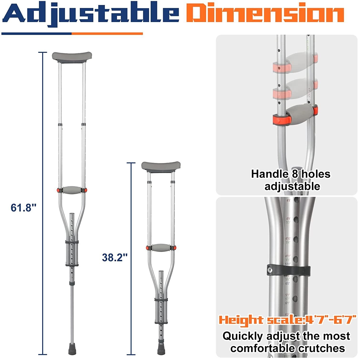 1.Aluminum Underarm Crutches are durable yet lightweight, with comfortable, adjustable padded hand grips and contoured underarm pads. Supporting weights of up to 300 pounds. Bolt fasteners allow easy adjustment of handle position. And the height scale provides walking assistance for users of different