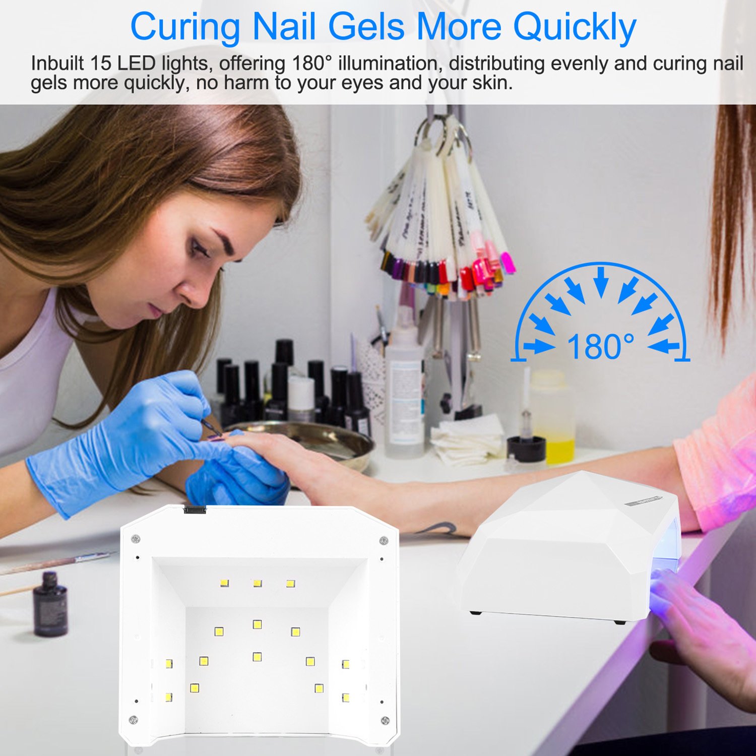 *Helpful For Drying All Nail Gels*:Double light source(UV and LED) from 15 LED lights,offering 180° illumination,distributing evenly and curing nail gels more quickly,suitable for drying UV Gel/Builder/LED Gel.