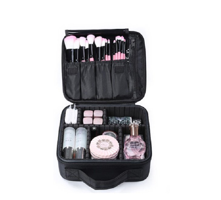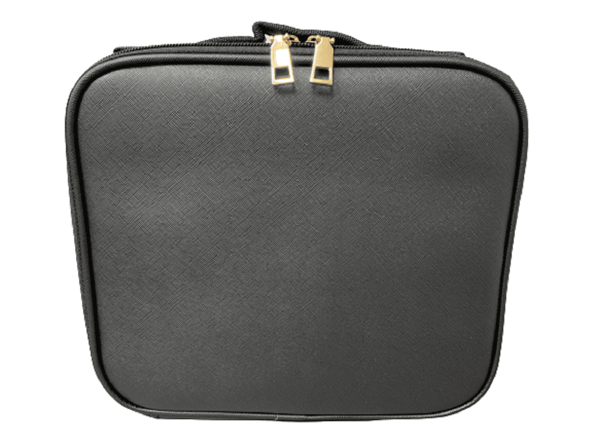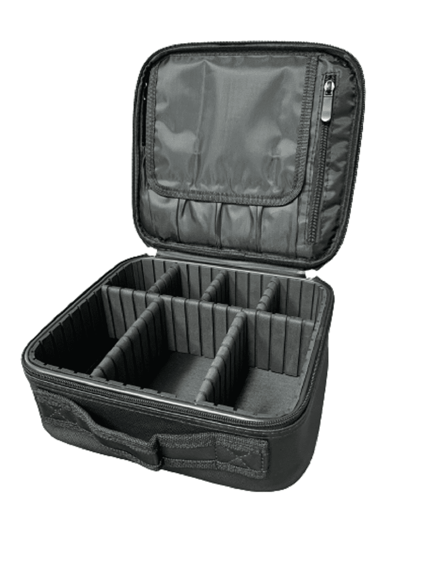 Customizable interior partitionsPremium wipe-clean PU leatherEVA high-density shockproof foam interior4 elasticized pockets in the lid for brushes and other taller itemsWipe-clean cover to protect items in the elasticized pocketsZippered pocket on the inside of the lid for additional storageSmooth, color-coordinated zipperSoft, wide handleLarge Capacity Size: 10'x9.5'x3.5'