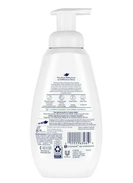 Looking for a lightweight skin cleanser that helps you get soft, healthy skin? Dove Deep Moisture Instant Foaming Body Wash gives you instantly soft skin and lasting nourishment with a light, airy lather. Dove body wash is sulfate free and beautifully light, making it a great body wash for dry skin. Each bottle features over 250 pumps of instant lather. This foaming body wash uses Dove NutriumMoisture™ technology-a combination of natural lipids and moisturizers to help support a healthy skin barrier. For best results, pump the instantly foaming sensitive skin body wash into your hand or onto a shower pouf. Massage it over your skin. Rinse off, revealing soft, smooth skin. Made with 100% gentle cleansers, Dove Instant Foaming Body Wash creates a soothing, light lather that leaves skin cleansed and feeling cared for. Dove care goes further than sensitive skin body wash with 78% recycled plastic bottles and, Dove does not test on animals anywhere in the world and is globally certified Cruelty-Free by PETA.