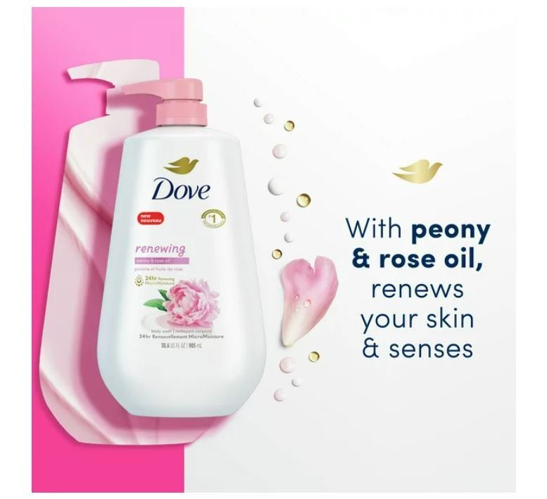 24HR RENEWING MICROMOISTURE: Dove Renewing Peony and Rose Oil Body Wash gently cleanses and nourishes the skin, leaving it renewed and healthy-looking for 24 hours.
