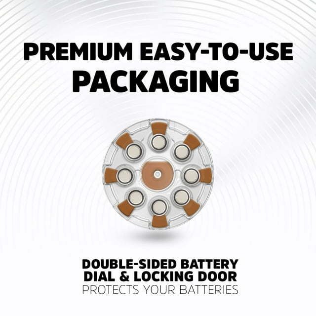 You’ll love hearing this: Energizer has its longest-lasting size 312 hearing aid batteries ever. And trust us, we know a thing or two about ears. These brown tab size 312 batteries deliver consistent sound quality across their life span for a better hearing experience. They’re also designed to prevent damaging leaks and premature low battery signals. The premium perforated packaging is more discrete and portable than our previous design. Just spin the double-sided battery dial to access the battery, install in your device with our long tabs, and easily lock the battery door to keep remaining batteries safely inside. Get our best performance and enjoy hearing everything the world has to offer with Energizer hearing aid batteries size 312.