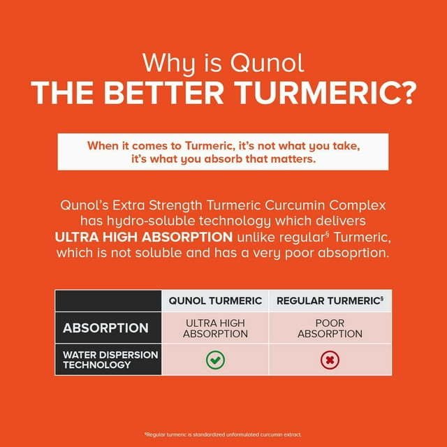 Why is Qunol the better choice? When it comes to Turmeric, it's not what you take, it's what you absorb that matters. Qunol Extra Strength Turmeric Curcumin is designed with our Patented Hydro-Soluble Technology to deliver Ultra High Absorption. Qunol Turmeric supports healthy inflammation response and joint health to help you meet your health goals.