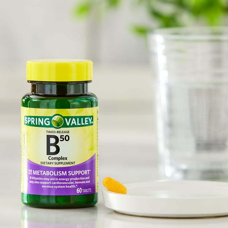 Our Spring Valley B-50 Complex Timed-Release Tablets Dietary Supplement is formulated for metabolism support.* It supplies eight essential B-vitamins in one convenient tablet. B-vitamins may aid in energy production and may also support cardiovascular, immune, and nervous system health.* This formula gradually releases vitamins over a period of time for better absorption. It is free from gluten, lactose, artificial colors and flavors. The suggested adult dosage is one tablet daily, preferably with a meal. You can rest assured that Spring Valley B-50 Complex Timed-Release Tablets Dietary Supplement is produced with strict quality guidelines and is backed by our quality guarantee.